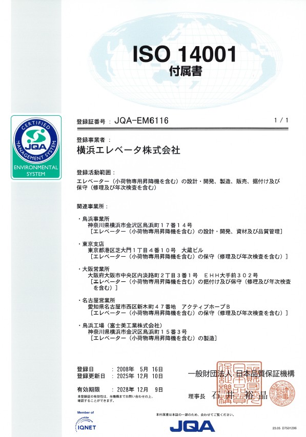 横浜エレベータ株式会社は、環境保全が人類共通の重要課題であることを認識し、社訓「明朗・誠実・親切」の下、エレベーター(小荷物専用昇降機を含む)の設計・開発、製造、販売、据付け及び保守(修理及び年次検査を含む)の事業活動を通して社会の発展に貢献すると共に、事業活動に伴って環境に与える影響の低減に努力し、環境に配慮した、人に優しいエレベーター作りに努めます。